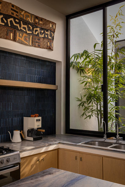 From there, the interiors follow a consistent logic. Lighting reads as architectural, furniture is selected for silhouette and substance, and artwork punctuates rather than fills. In the kitchen, a hand-selected textile panel above the stove introduces pattern and softness, an intimate counterpoint to the surrounding stone and millwork.